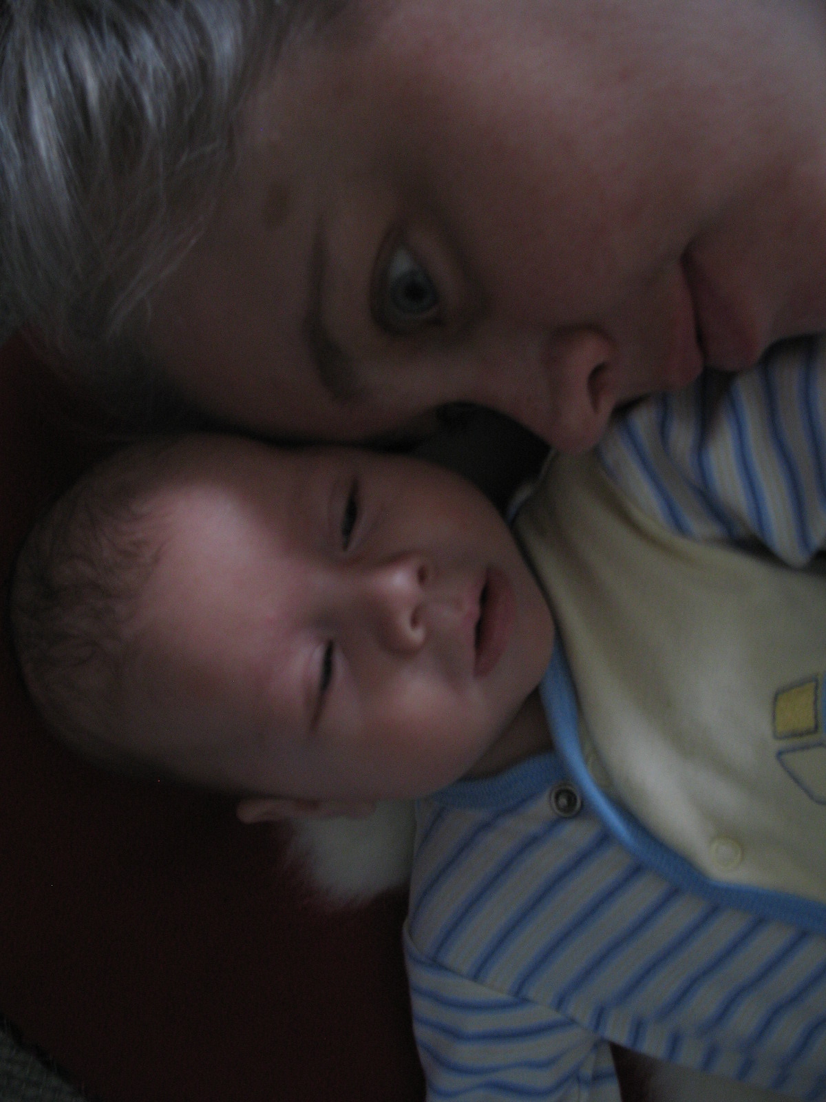 I realize this photo is sideways, but that’s kind of how I’m feeling these days. Not upside down any longer, which is a good thing, but not wholly myself either. We’ve had an exciting couple of weeks — we’ve been getting out a whole lot, we’ve started to see the world from the squished up view of the Baby Bjorn, which is far, far easier in this weather than the stroller, we’ve gone skating two Sundays in a row, and out for dinner a whole bunch. We’ve still got a wee bit of the Witching Hour (last night he cried for a record ten minutes) but we’ve collapsed entirely into “Accidental Parenting” as The Baby Whisperer (suck it) would say.